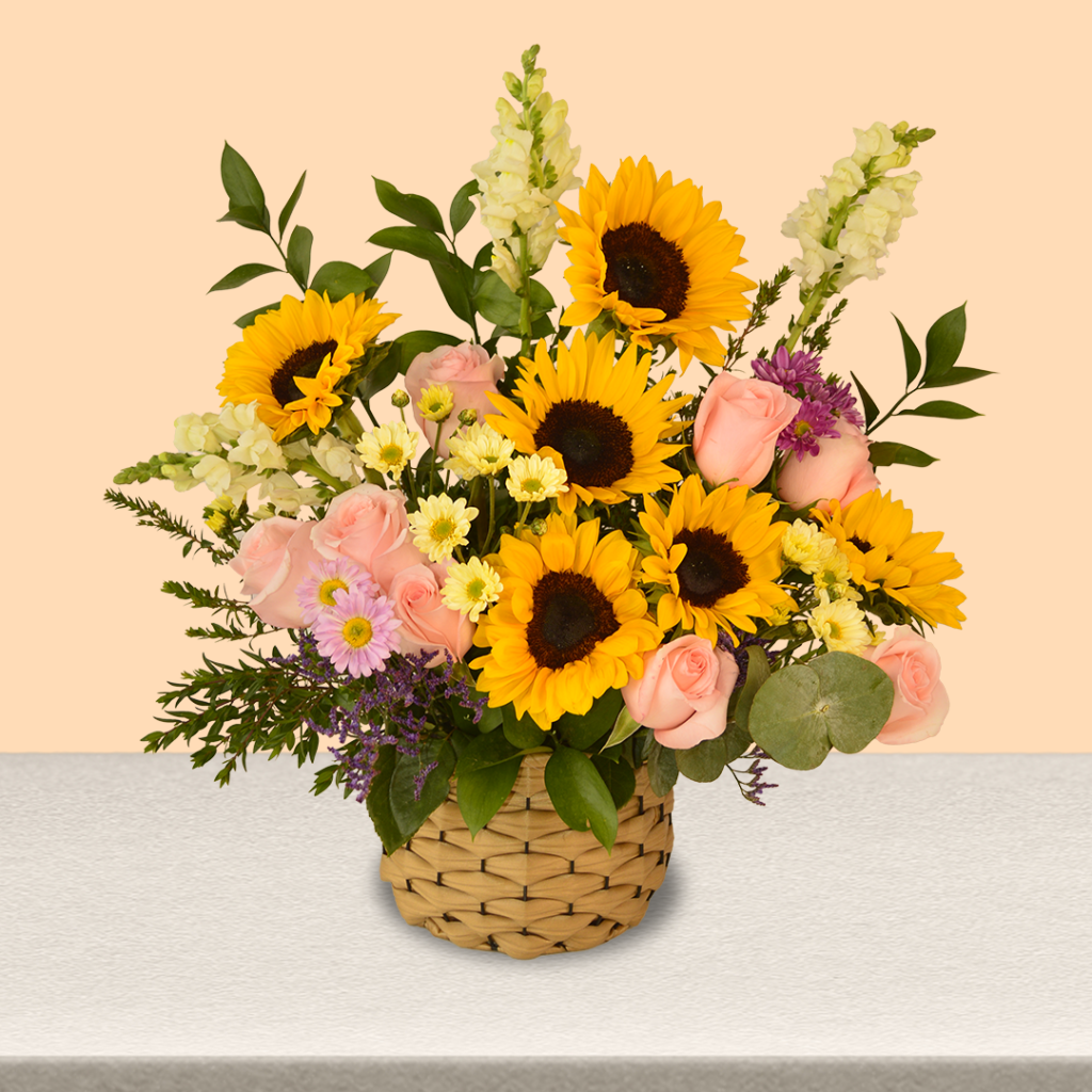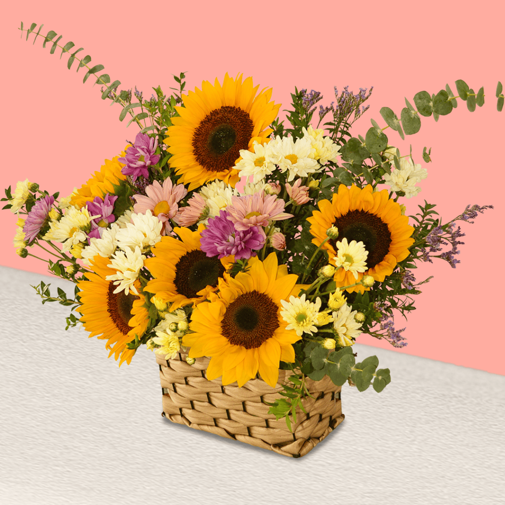 Arreglo Premium de girasoles con rosas rosadas