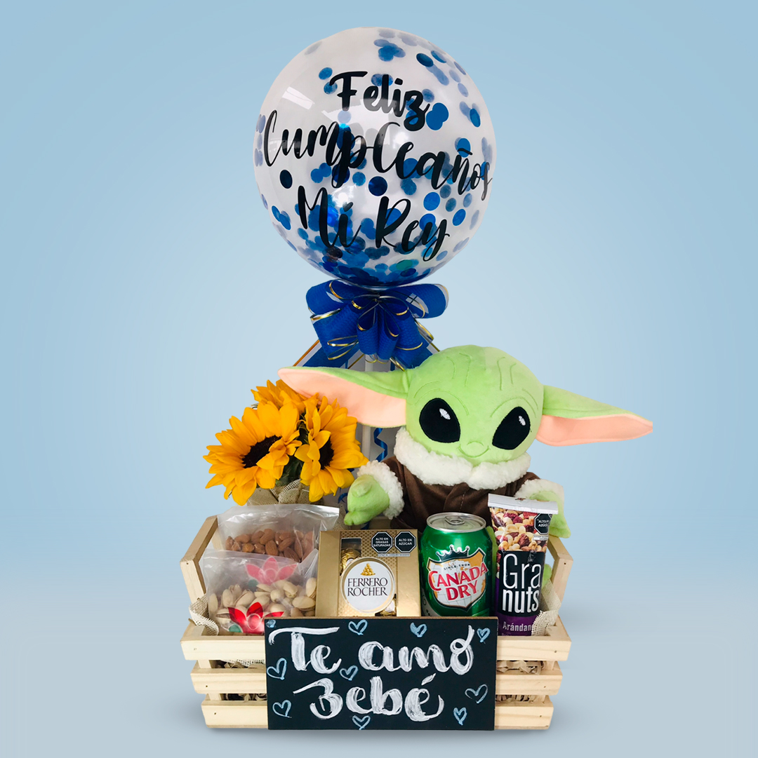 Hermoso Gift Box que contiene un peluche Baby Yoda, 3 girasoles, frutos secos, una caja Ferrero Rocher de 4ud, una bebida Canada Dry, un Granuts, dedicatoria y globo (GLOBO ÚNICO CON MENSAJE: FELIZ DÍA PAPÁ); todo dentro de una caja de madera artesanal con una pizarrita personalizable.