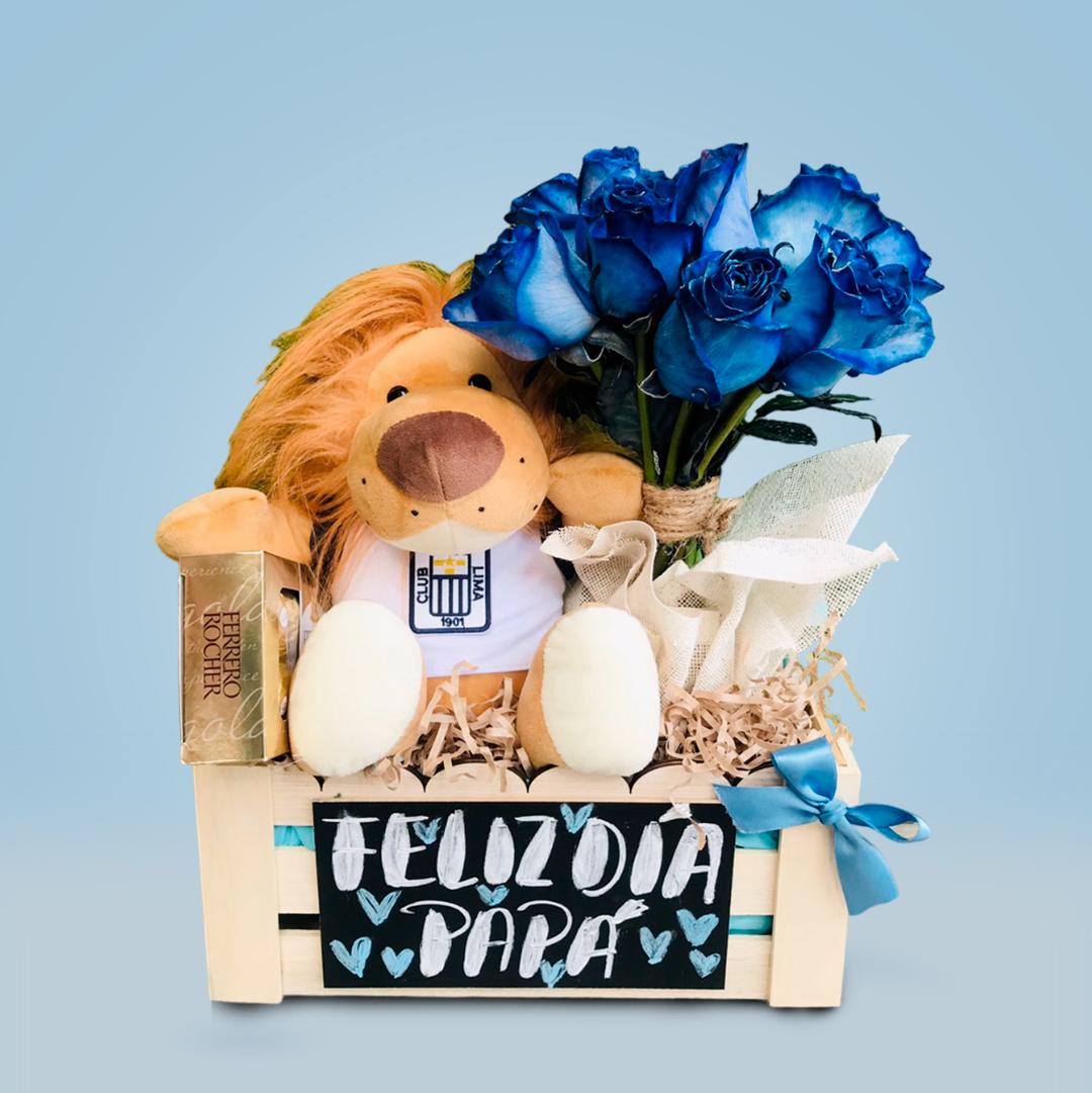 Hermoso arreglo floral con 12 rosas azules naturales más un León de peluche vestido con el polo del equipo favorito de tu papi (alianza Lima, Universitario y Sporting Cristal) y una caja de chocolate Ferrero Rocher; todo dentro de una caja de madera artesanal con pizarrita personalizable.
